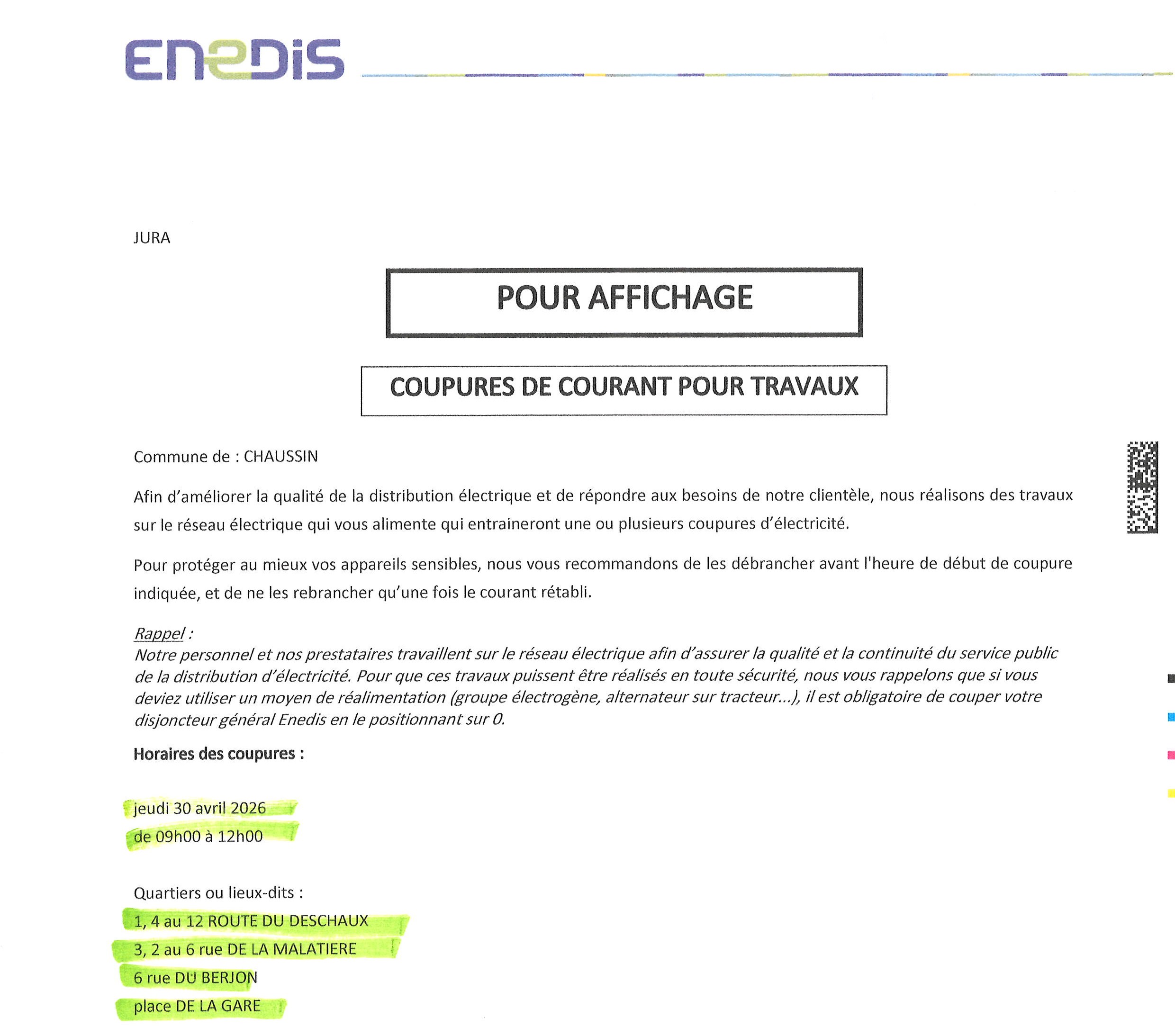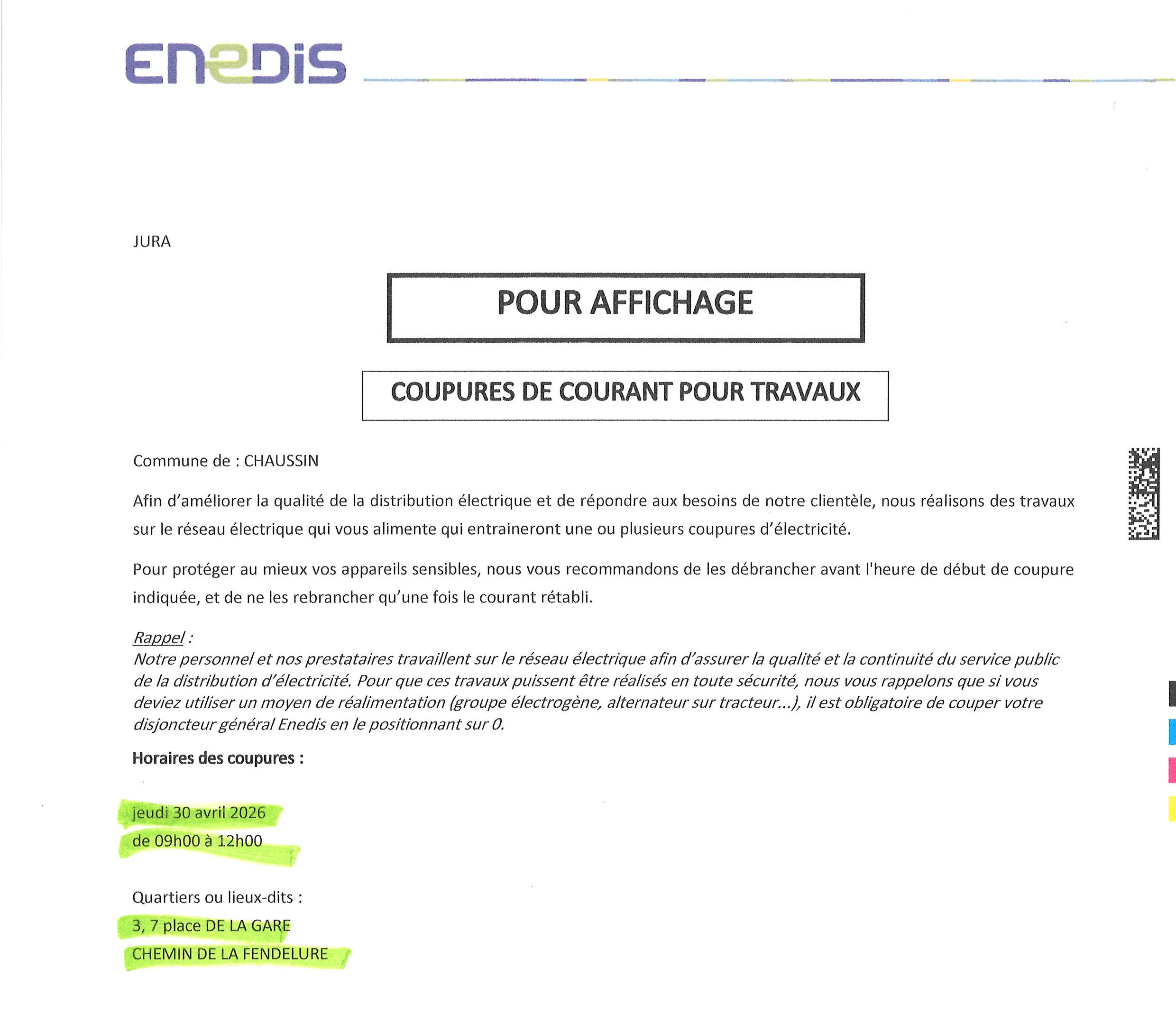 INFORMATION : Coupure d'électricité pour travaux le jeudi 30 avril 2026